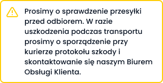 Pred prevzatím zásielky od kuriéra ju skontrolujte. V prípade poškodenia počas prepravy spíšte s kuriérom protokol o škode a kontaktujte náš zákaznícky servis.